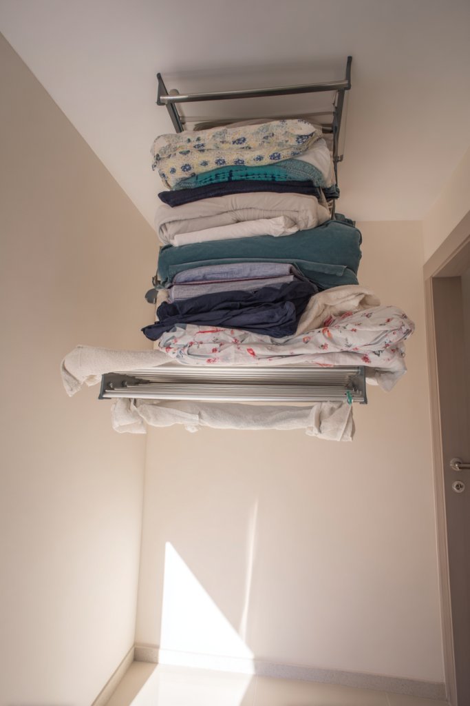 Imagine a sturdy metal or wood rack mounted high on the ceiling or above your closet. It holds bins or boxes filled with off-season clothes, holiday decorations, or extra linens. When organized, the space looks clean and uncluttered, and your belongings are accessible without taking up precious floor or closet space. The rack adds a functional industrial or minimalist touch.